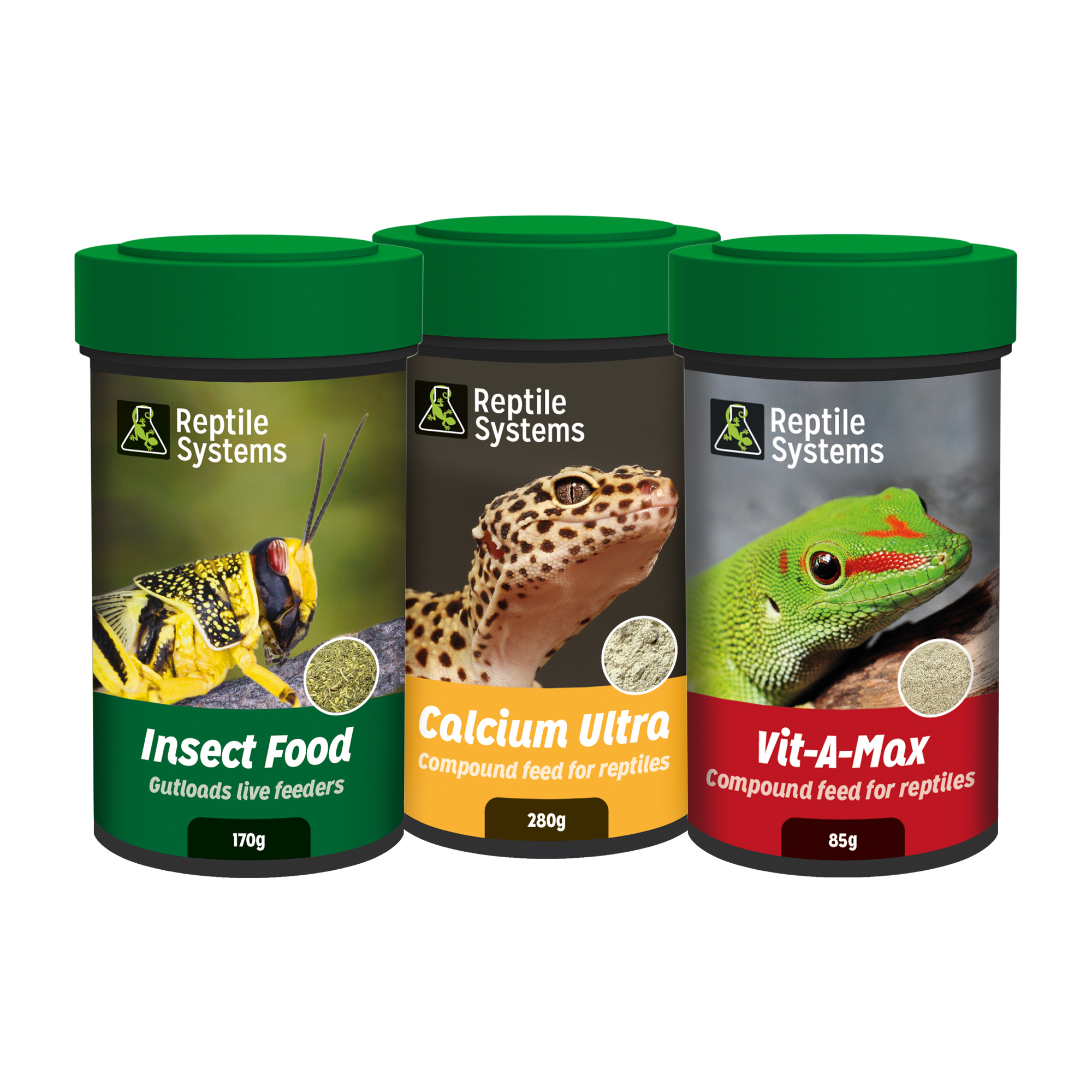 C'est là que les deux autres produits de la gamme, Vit A Min et Insect Food, comblent les lacunes du régime alimentaire des captifs. Utilisés en association avec des produits d'éclairage et de chauffage appropriés, ils devraient répondre aux besoins de votre animal.